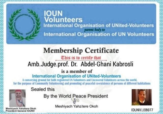 في سبيل دعم العمل التطوعي المجتمعي وتعزيزا للتعايش السلمي بين الشعوب منحت المنظمة الدولية لمتطوعي الامم المتحدة “ioun volenteers international organization of united volunteers” الدكتور عبد الغني قبرصلي شهادة العضوية التقديرية نظراً لمساهمته الفعالة في نشاطاتها، وتفعيل دورها ومن الجدير ذكره بأن هذه المنظمة العالمية قد أنشأت لتكون مقر التقاء لكل من متطوعي الأمم المتحدة المسجلين والمتطوعين غير المشمولين في جميع أنحاء العالم. وقد صادق على هذه الشهادة رئيس المنظمة للسلام العالمي السيد ميشياش يهزبتري أوكوه.