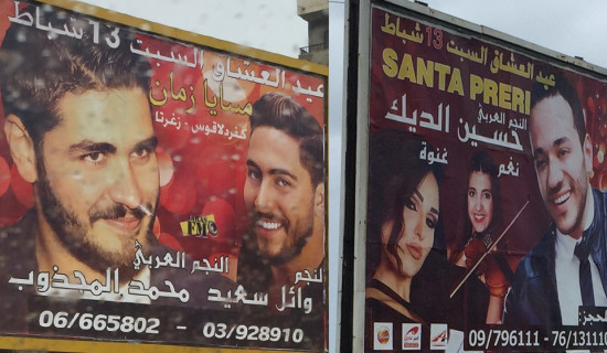 وأثناء جولتنا لفتتنا لافتة إعلانية أخرى للفنّان السّوري محمد مجذوب تعرف به أيضا بالنّجم العربي فهل لقب نجم عربي أصبح يتنافس عليه كل من محمد مجذوب وحسين الديك؟ّ علما أن الفارق كبير بين محمد مجذوب الذي يتمتع بصوت فنّي نادر وحسين الدّيك الذي يمتلك صوت متواضع ويتّكل على فرقته الفنّية في حفلاته!
